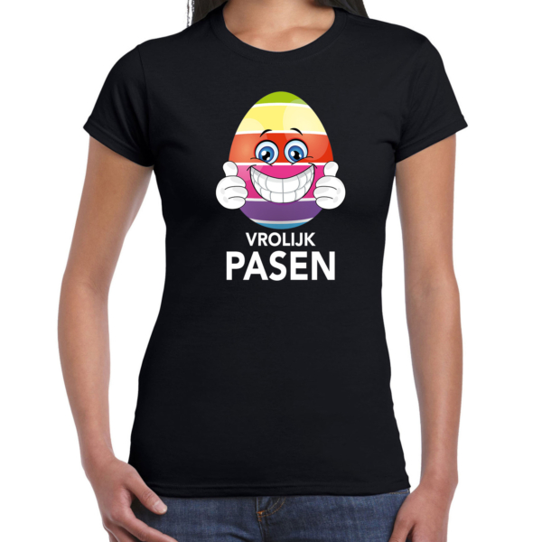Paasei met duimen schuin omhoog vrolijk Pasen t-shirt zwart voor dames – Paas kleding / outfit